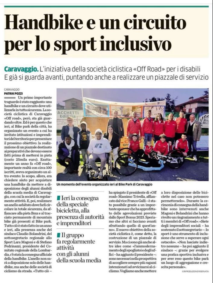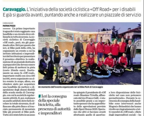 Venerdì 22 Marzo il presidente della società Caravaggio OffRoad Massimo Trivella e il vice Franco Galli hanno presentato con orgoglio il nuovo progetto: la realizzazione di un anello asfaltato ,che circonda la pista di BMX , e l’acquisto di una Handbike che permetteranno anche ai giovani ciclisti diversamente abili di praticare attività sportiva in sicurezza. Ma non solo il nuovo anello sarà disponibile anche per le società di ciclismo da strada e per le scuole del territorio con le quale vi è una collaborazione che dura da anni attraverso percorsi di avvicinamento al ciclismo fuoristrada. Presenti al Bike Park tanti nomi illustri tra cui il sindaco di Caravaggio Claudio Bolandrini, l’assessore allo sport Ivan Legramandi ,il Presidente del Comitato Regionale della Lombardia Stefano Pedrinazzi e il Sottosegretario Regionale allo sport Lara Magoni ,che è intervenuta dicendo “Siete imprenditori sociali, portate avanti lo sport come strumento di inclusione, di aggregazione. Lo sport è quell’elemento universale che supera ogni ostacolo. ” Ha poi aggiunto rivolgendosi ai giovani atleti “Mi sono divertita molto facendo sport. Oggi sono fortunata ad essere qua e occuparmi di voi , di voi che siete il presente ed il futuro.”
